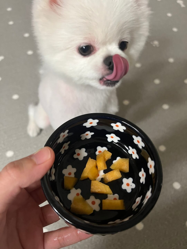 감은 딱딱 과일입니다. 강아지가 잘 씹지 않고 삼킬 경우 경우 소화불량을 유발할 수 있기 때문에 작게 잘라 급여해주세요.
