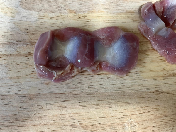 물기가 제거된 닭근위를 가로로 놓고 칼로 썰어줍니다. 그냥 말리면 크고 잘 마르지 않기 때문에 한번 잘라 말라주는 것을 추천드립니다.