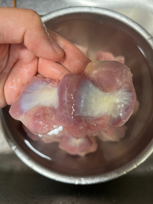해동과 소독이 완료된 닭근위를 손질해줍니다. 닭근위에 붙어 있는 막을 제거해주는 것이 좋습니다. 막을 제거하면 더 깔끔하게 만들 수 있습니다. 막은 손을 이용하여 쉽게 제거 가능합니다. 막을 다 제거한 닭근위는 채에 받쳐 물기를 제거해줍니다.