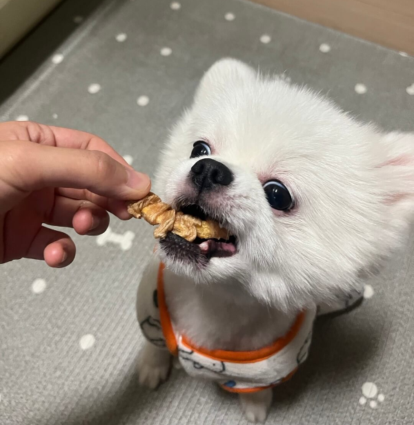 완성된 간식을 꾸마에게 주었습니다. 건조가 잘되어 먹을 때 나는 빠삭빠삭 한 소리가 좋습니다. 너무 잘 먹어서 더 주고 싶지만 간식을 너무 많이 먹으면 안 되기 때문에 한 개만 주었습니다. 소형견 기준 황태 닭 안심 말이는 하루에 1개~2개 정도 주는 것을 추천드립니다.