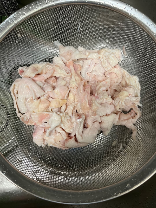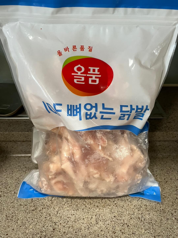 저는 올품에서 나온 냉동 무뼈 닭발을 사용했습니다. 1kg에 23990원으로 구매했습니다. 먼저 냉동 닭발을 차가운 물에 담가 해동해주세요. 차가운 물에 5분~10분 정도 담그면 해동이 완료됩니다. 그 후 밀가루를 뿌려 치대 주며 불순물을 제거해주시면 됩니다. 박력분, 중력분, 강력분 집에 있는 아무 밀가루나 사용하시면 됩니다.
