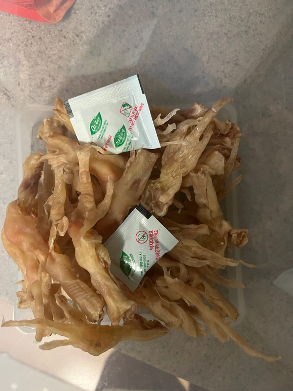 건조가 완료된 닭발을 한 김 식힌 후 밀폐용기에 식품용 제습제를 넣어 냉장 보관해주시면 됩니다. 양이 너무 많을 경우에는 당장 먹을 것은 냉장 보관하시고 나머지는 냉동 보관하였다 급여하기 1시간 전 실온에 꺼내 두시고 냉기가 날아가면 강아지에게 급여하시면 됩니다.