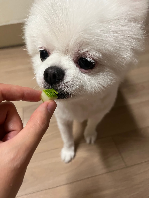 강아지가 잘 씹지 않고 넘길 경우 목에 걸릴 수도 있고 급하게 먹어 구토를 할 수도 있으니 작게 썰여서 급여하는 것을 추천드립니다.