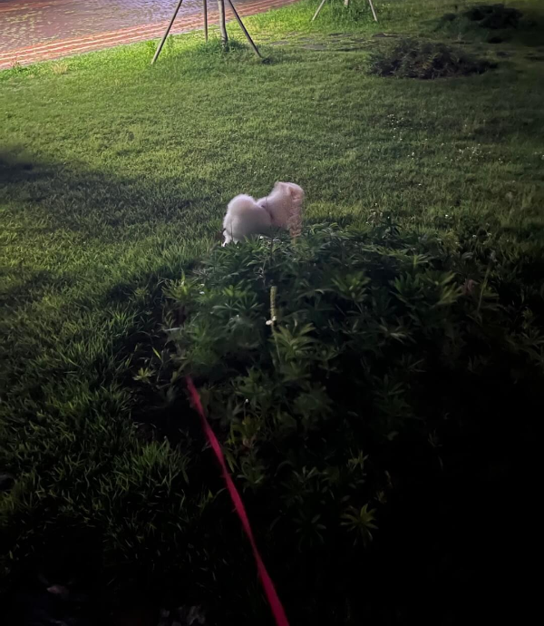 여름철 산책은 주로 짧게 동네 산책을 합니다. 여름철에는 늦은 밤 산책을 하지만 습하기 때문에 조금만 걸어도 꾸마가 힘들어하기 때문에 20분~30분 정도의 코스로 동네를 가볍게 도는 편입니다.